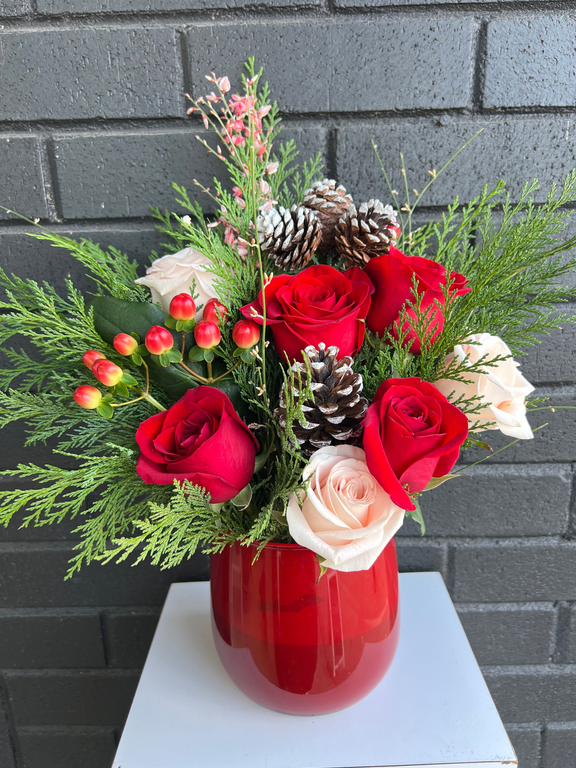 A lush mix of pink and red roses nestled among fragrant greens, sparkling berries, and earthy acorns—capturing the warmth of holiday color in a forest-inspired design.