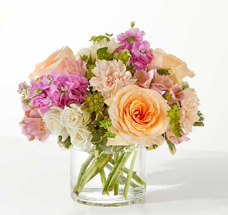 Blush Whisper is a low, garden-style arrangement featuring soft pastel roses, carnations, alstroemeria, and delicate spray roses. Designed in a low vase for a full, lush look, this piece feels romantic, airy, and effortlessly elegant — perfect for spring gatherings, bridal events, or simply adding a touch of softness to any space