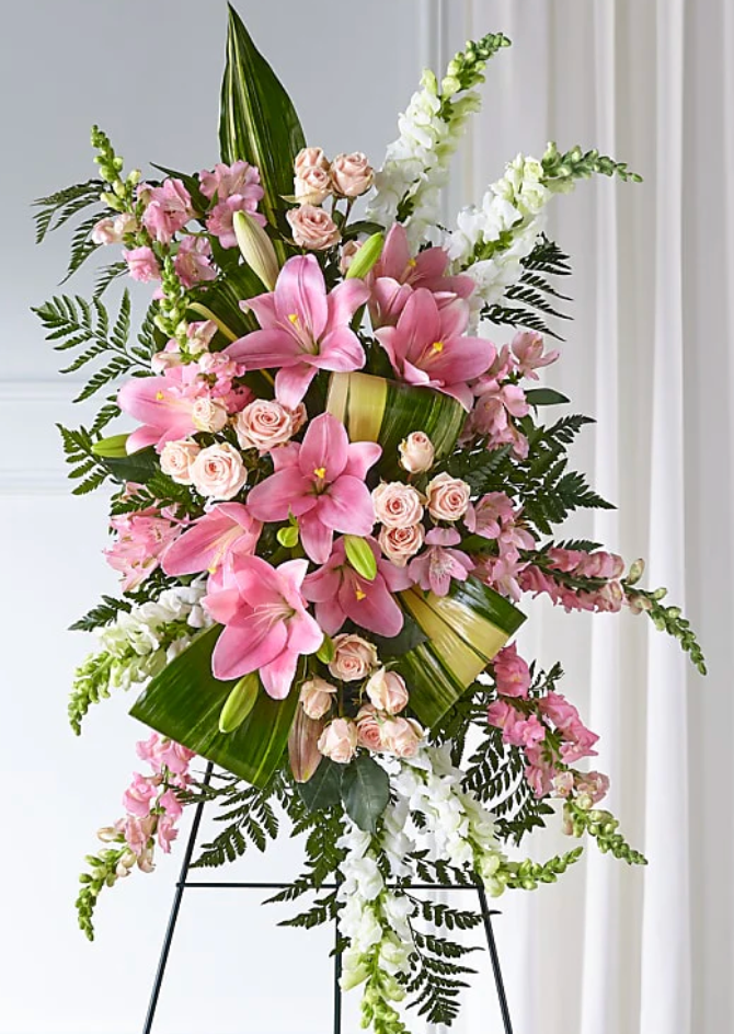 A striking standing spray featuring elegant lilies, vibrant alstroemeria (Peruvian lilies), and tall snapdragons. This arrangement exudes beauty and grace, symbolizing purity, strength, and remembrance. The combination of lush blooms creates a powerful and dignified tribute, offering comfort and honoring a life lived.
