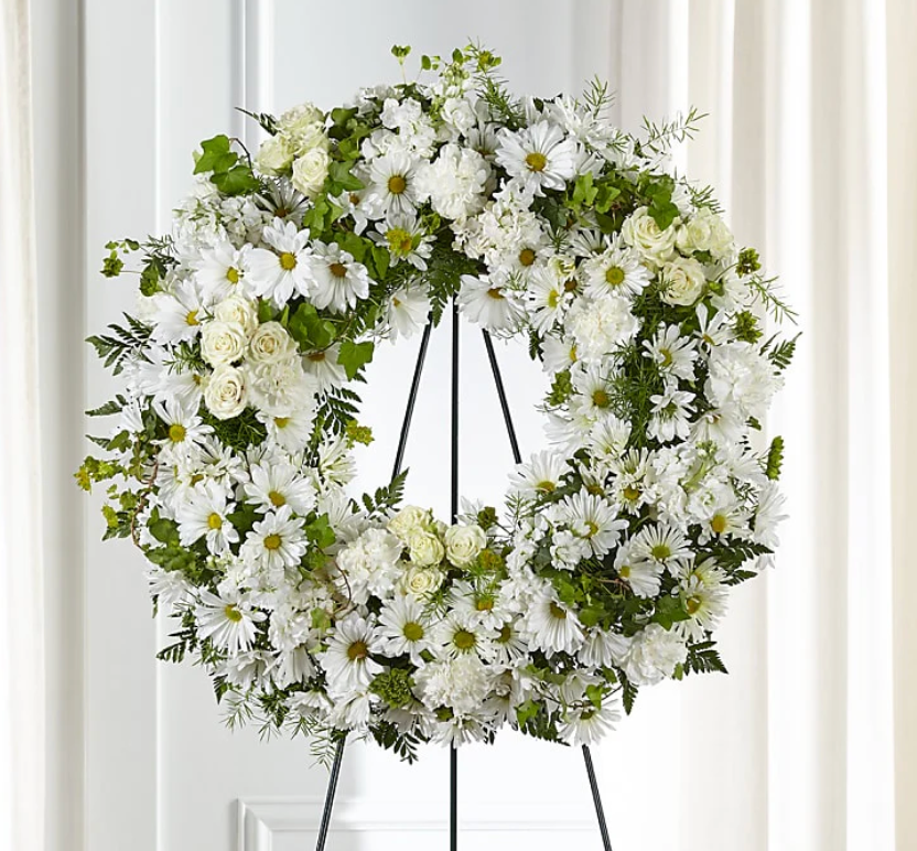 A thoughtful funeral wreath crafted with vibrant carnations, delicate daisies, elegant roses, and fragrant stock. This graceful arrangement symbolizes love, remembrance, and respect, offering a heartfelt tribute to a cherished life. The blend of soft and bold blooms creates a serene and meaningful expression of sympathy.