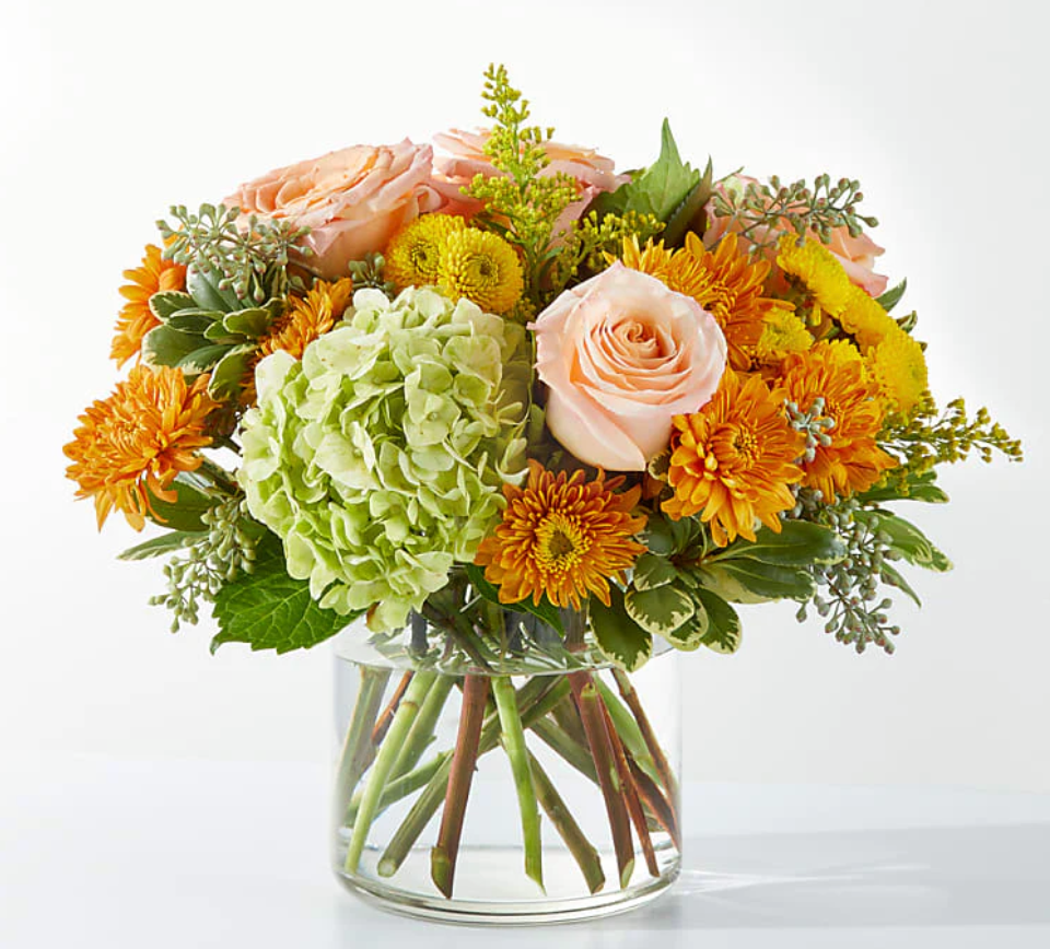 A charming arrangement featuring elegant roses, lush hydrangeas, and vibrant solidago for a perfect touch of color and texture.