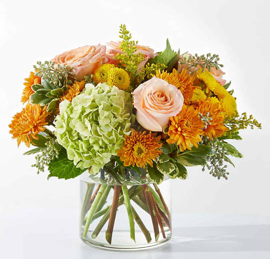 A charming blend of elegance and warmth, this bouquet features classic roses, lush hydrangeas, and cheerful solidago. Perfect for brightening any space, it brings together soft textures and golden tones in a graceful, timeless arrangement.