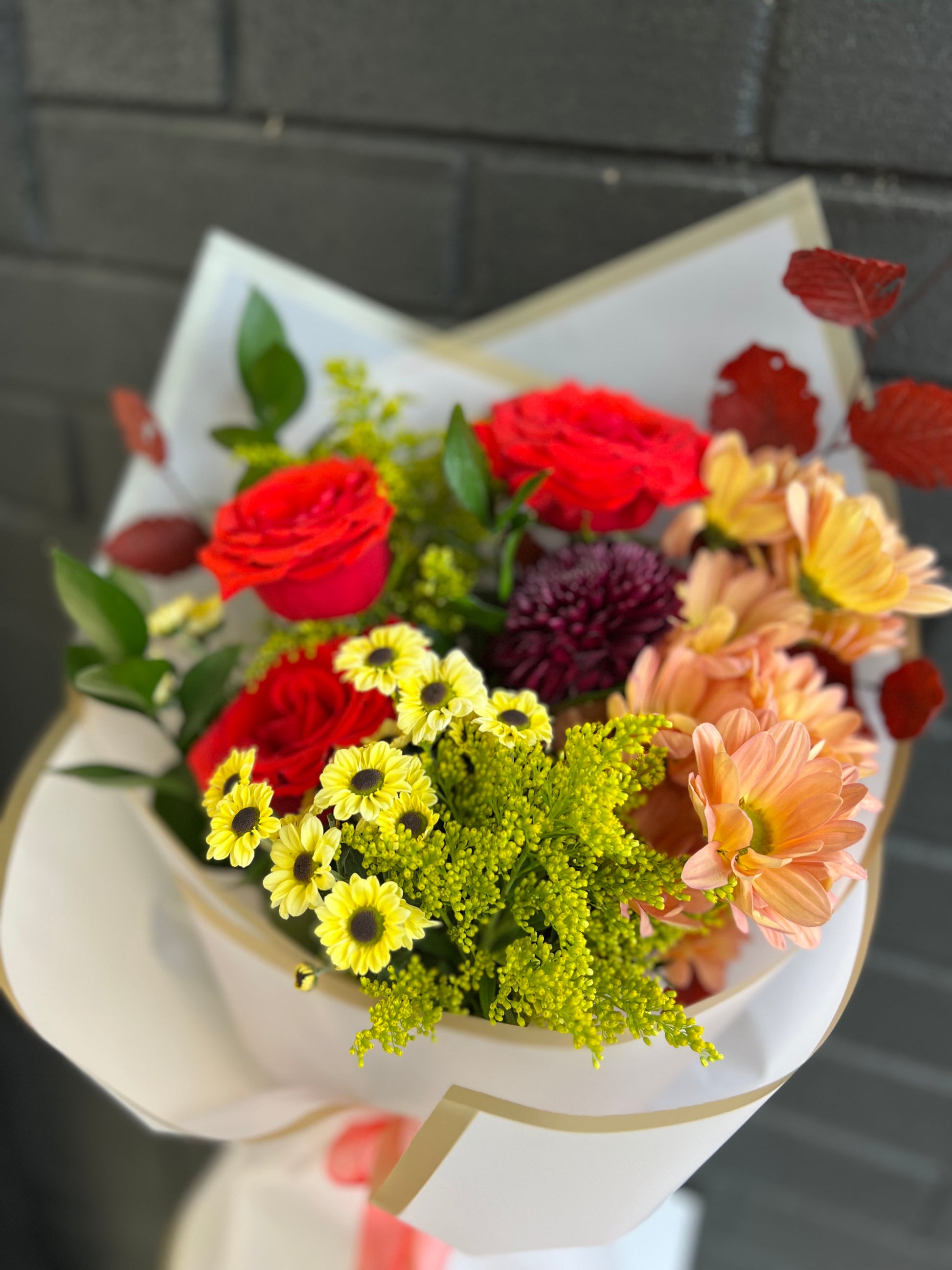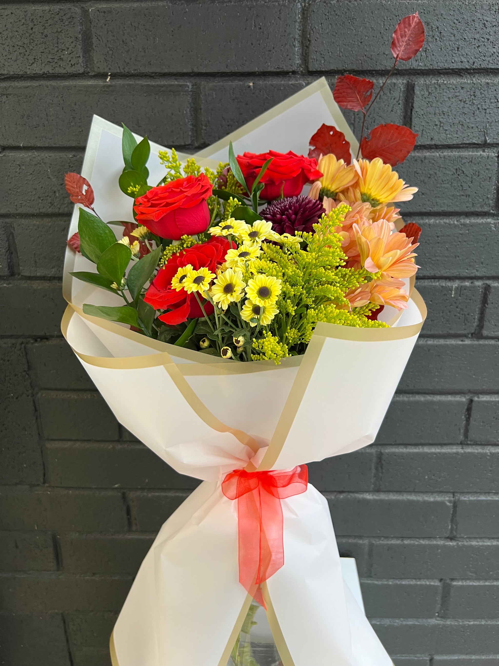 A rich and radiant celebration of the season, this bouquet features crisp red leaves, vibrant orange roses, golden yellow chrysanthemums, cheerful solidago, and deep crimson poms. Bursting with autumn warmth, it’s the perfect way to bring the beauty of fall indoors.