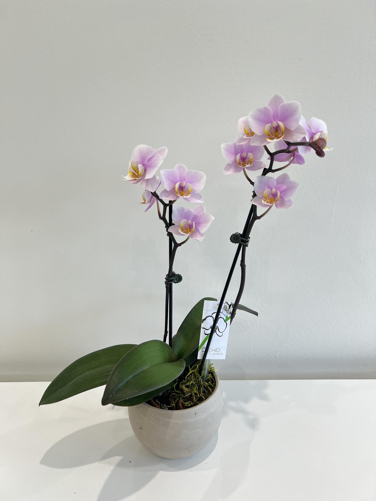 A delicate miniature orchid, with soft pink petals gently curling at the edges, stands gracefully in a handcrafted ceramic pot. The blooms, though small, are striking—each one a perfect blend of blush and ivory, like watercolor brushed onto silk. Its slender green stem rises from a bed of rich moss, anchored in a smooth, glazed pot that complements its soft elegance. The pot, a muted ivory or pastel tone, adds a touch of modern simplicity, allowing the orchid’s natural beauty to shine. Compact yet captivating, this tiny orchid brings a whisper of nature’s charm into any space—a perfect balance of serenity and sophistication.