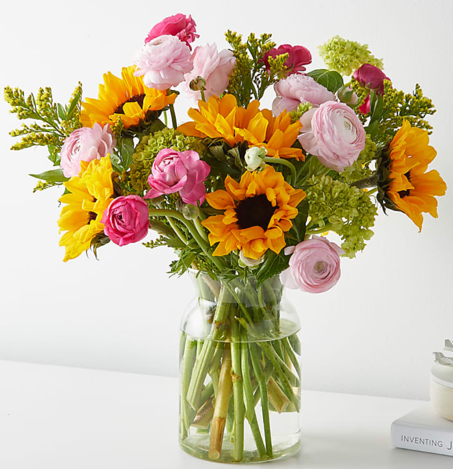 This vibrant arrangement features a stunning mix of sunflowers, ranunculus, and hydrangeas, creating a cheerful and elegant bouquet. The bright, golden sunflowers bring a bold, sunny touch, while the soft, layered petals of the ranunculus add a touch of romance and texture. The lush hydrangeas, with their full, rounded blooms, add depth and softness to the arrangement.