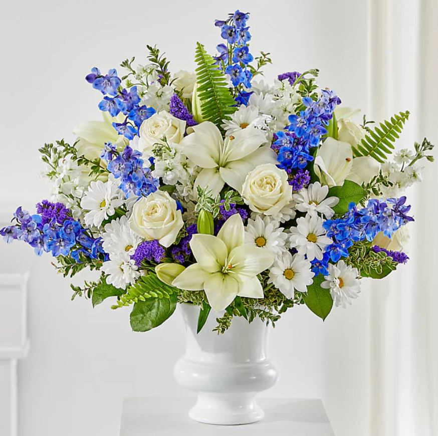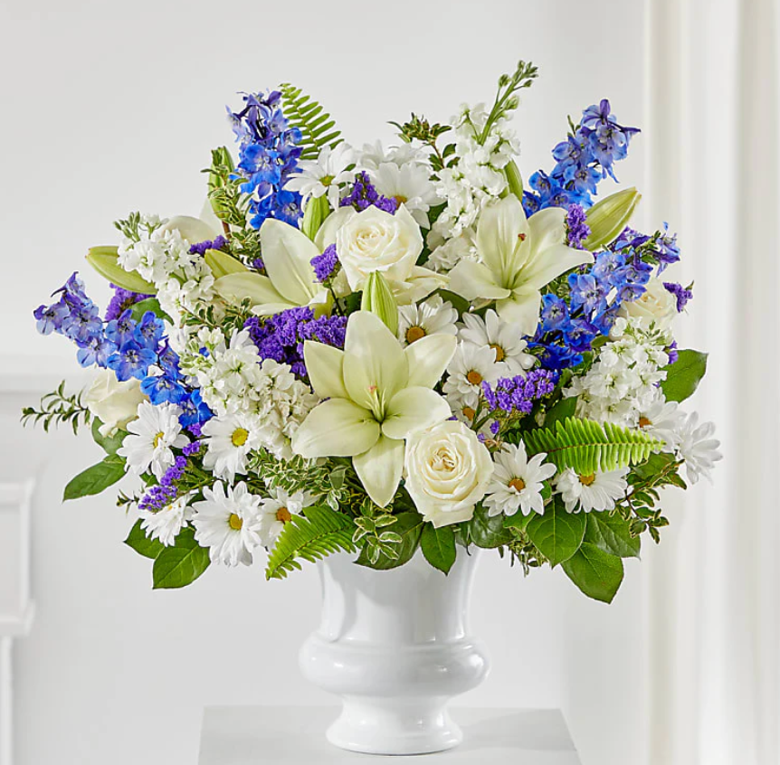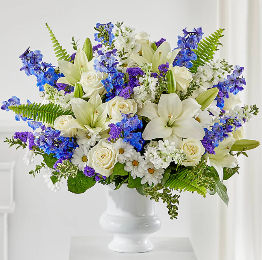 A stunning floral arrangement featuring the timeless elegance of roses, the striking beauty of delphinium, the sweet fragrance of stock, the cheerful charm of daisies, and the graceful presence of lilies. This vibrant mix of flowers brings together a sense of peace, joy, and remembrance, making it a beautiful tribute for any occasion of reflection or honoring a loved one.